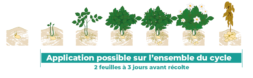 Orocide Plus s’applique tout au long du cycle de la pomme de terre. Il ne laisse aucun résidu à la récolte, ce qui permet une grande souplesse d’emploi en fin de cycle, avec un délai avant récolte très court (3 jours).